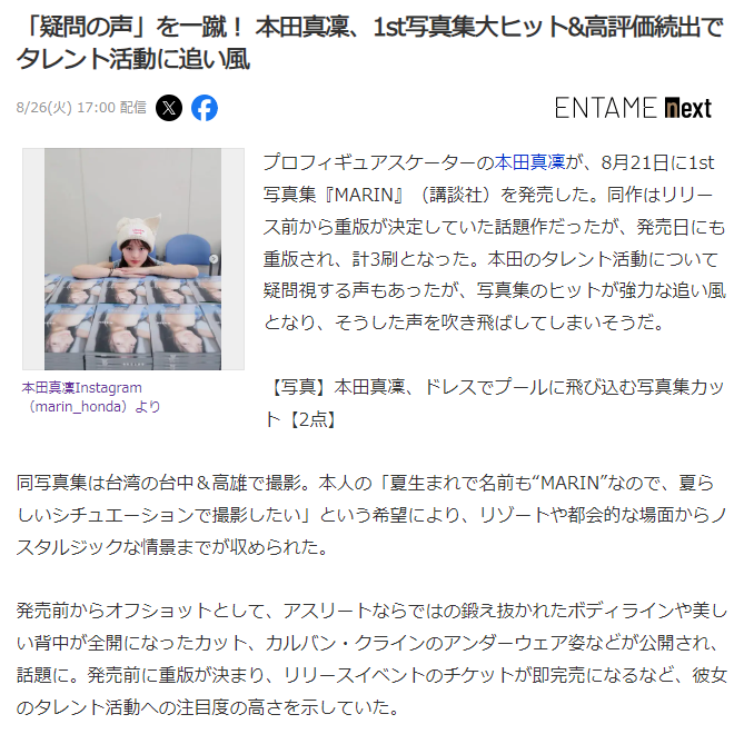 前日本花样滑冰女单选手本田真凛推出个人首本写真集后,销售情况非常火爆,发售当天就被抢购一空,出版商不得不紧急加印三次,这也回击了外界关于本田真凛利用运动员时期积累的知名度转战娱乐圈享受“特殊待遇”的质疑。